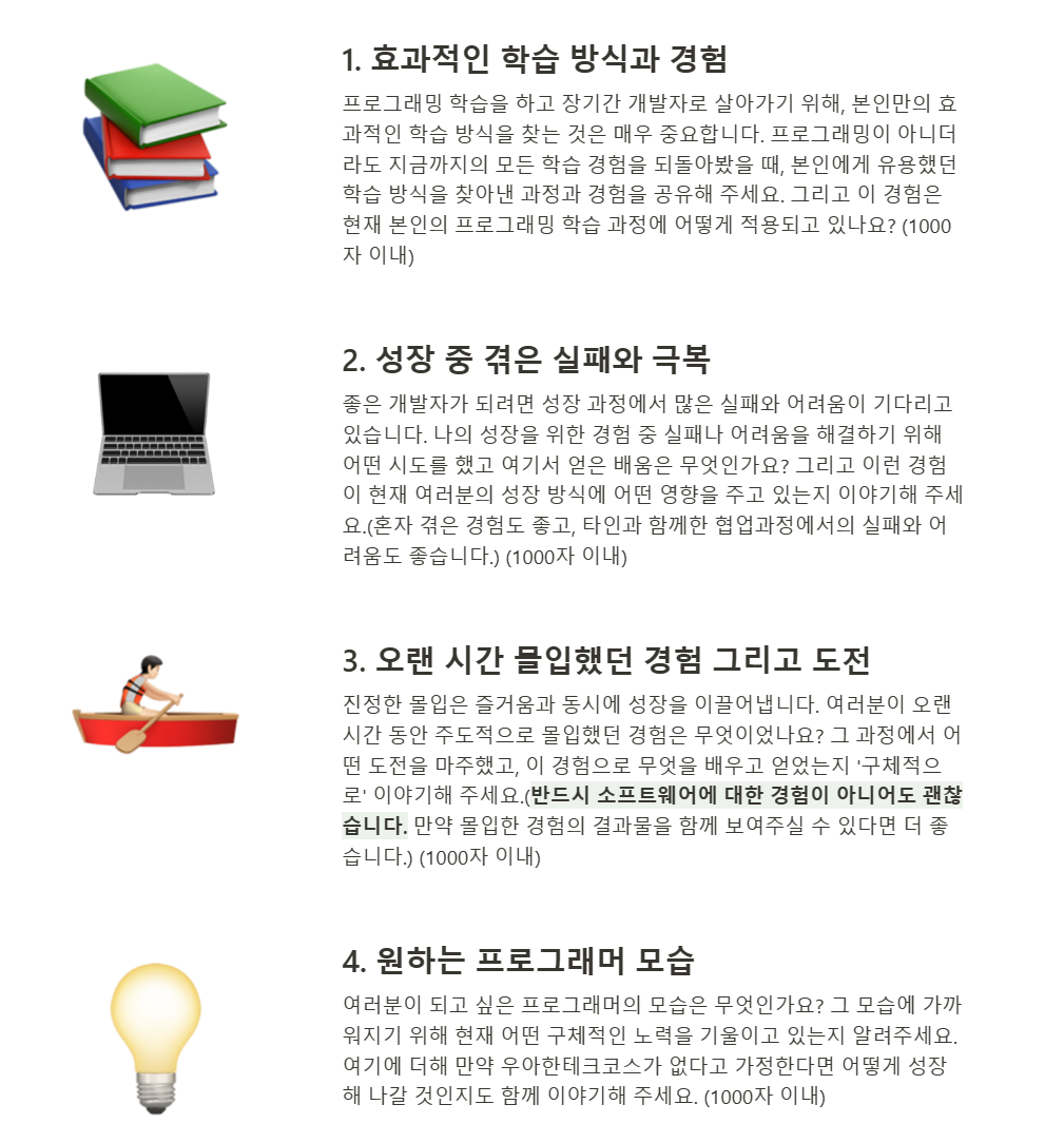 우테코 측에서 친절하게도 서류 접수 시작일 한참 전부터 '미리 생각해볼 질문'들을 알려주었다. 해당 질문들은 지원서에 그대로 나오니 미리 준비해 놓아도 좋을 것 같다. 질문들은 총 4가지였으며 가장 고민이 많았던 질문은 3번이었다.
